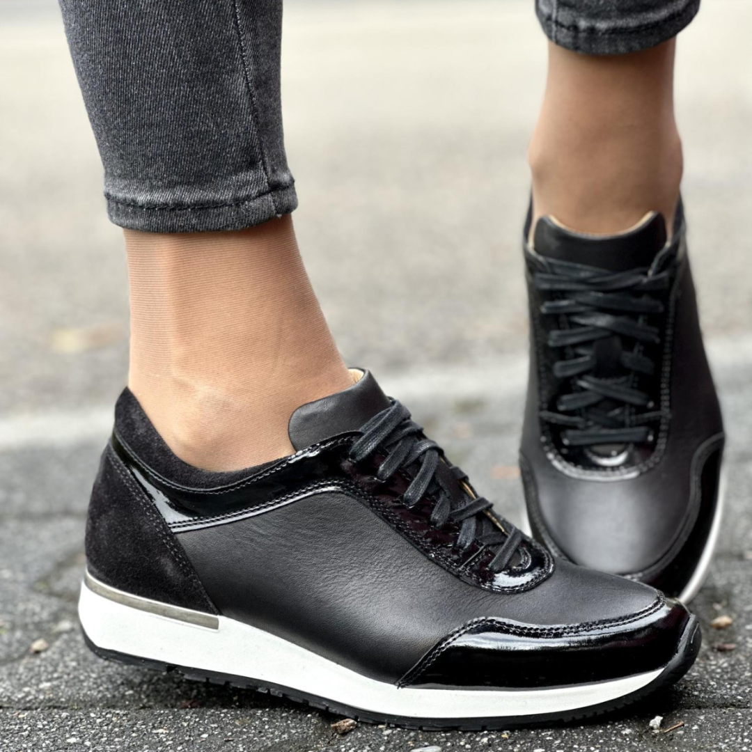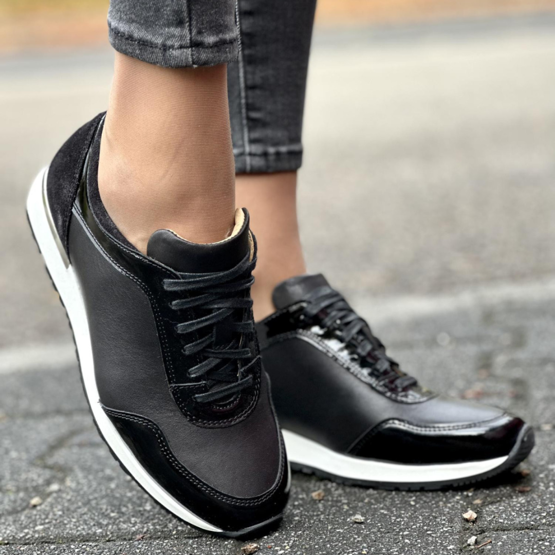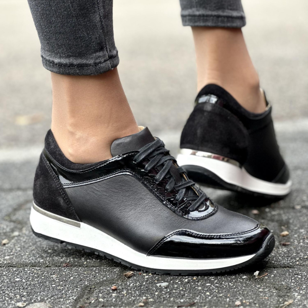 Această încălțăminte se remarcă prin designul său sofisticat care îmbină diferite finisaje de piele naturală. Mixul dintre strălucirea lacului și finețea pielii întoarse creează un contrast vizual unic, oferind un aer de modernitate și eleganță sportivă care se adaptează perfect oricărui look contemporan.